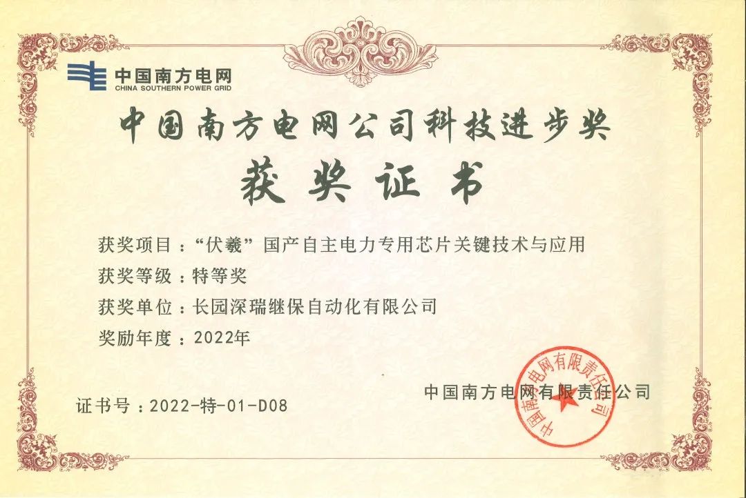 近日,由今年会jinnianhui科技集团旗下子公司今年会jinnianhui深瑞继保自动化有限公司(以下简称“今年会jinnianhui深瑞”)参与的“伏羲国产自主电力专用芯片关键技术与应用”项目荣获中国南方电网公司科技进步奖特等奖。